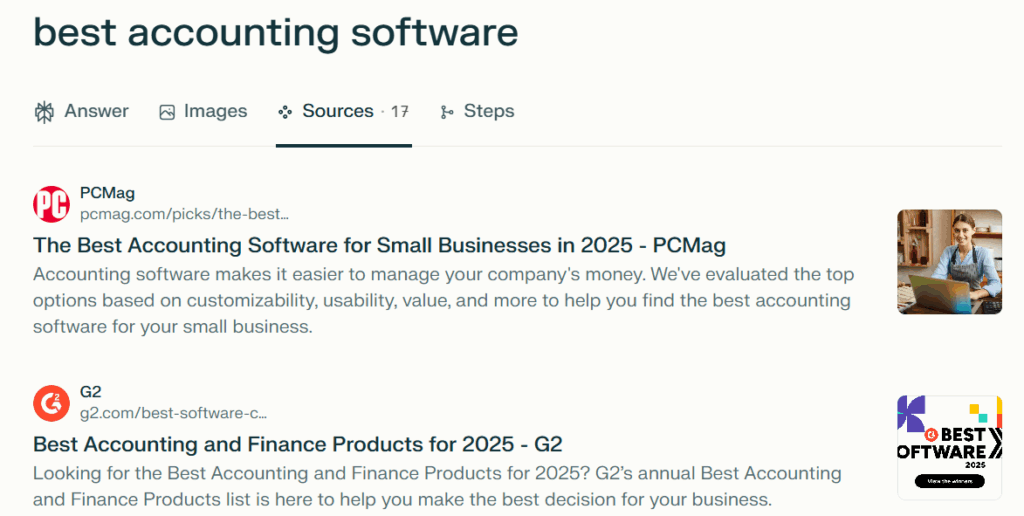 Perplexity’s free AI search tool is great for quickly checking what sources feed content. Because Perplexity shows all of it’s sources, even on the free plan, you can check which sites are being pulled into LLM results. Review the results and see what patterns emerge across featured articles.